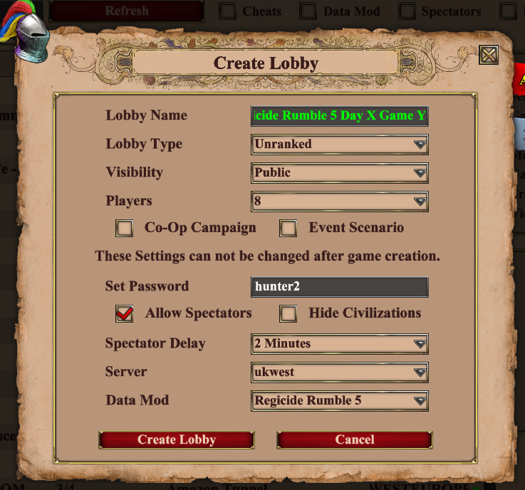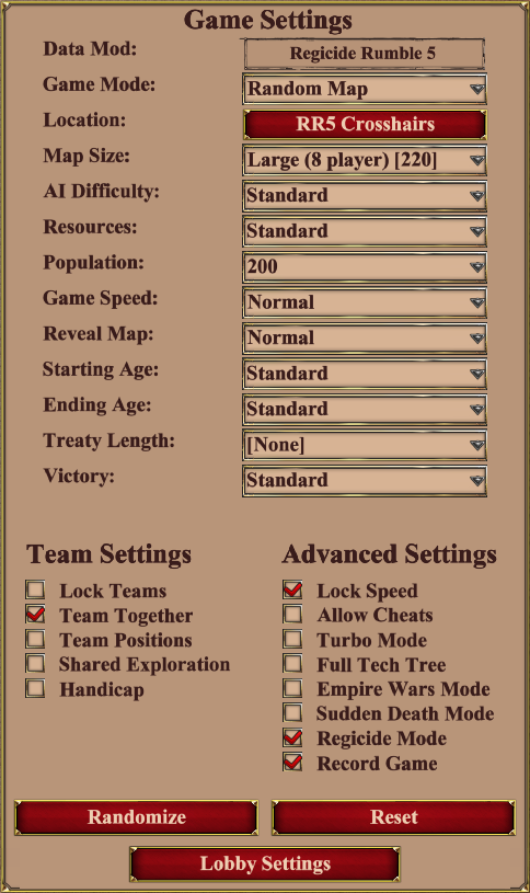 Regicide Rumble games will be played on maps that are suited for regicide diplomacy settings. Maps will not be released until after players are placed and schedule is set. The settings are Standard Victory, Regicide & Unlocked teams. This means victory can be achieved by defeating everyone, relic victory, or wonder victory.